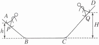 【典例5】 滑板运动是一项惊险刺激的运动,深受青少年的喜爱。图中$ABCD$为滑板的运动轨道,$AB$和$CD$是两段与水平面夹角均为$\theta$的光滑斜面,底部与水平面平滑相接,粗糙水平段$BC$的长度$L = 5m$。一运动员从$P$点以$v_{0}=6m/s$的初速度下滑,经$BC$后冲上$CD$轨道,达到$Q$点时速度减为零。已知运动员连同滑板的质量$m = 70kg$,$h = 2m$,$H = 3m$,$g$取$10m/s^{2}$,求:(结果可带根号)