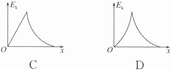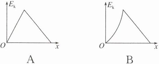 [典例7] A 解析 设斜面倾角为$\theta$,物块与斜面间动摩擦因数为$\mu_{1}$,则物块在斜面上下滑水平距离$x$时,根据动能定理有$mgx\tan\theta-\mu_{1}mg\cos\theta\cdot\frac{x}{\cos\theta}=E_{k}$,整理可得$(mg\tan\theta-\mu_{1}mg)x = E_{k}$,即在斜面上运动时动能与$x$呈线性关系;当小物块在水平地面上运动时,设物块与水平地面间的动摩擦因数为$\mu_{2}$,由动能定理有$-\mu_{2}mg(x - x_{0})=E_{k}-E_{k0}$,其中$E_{k0}$为物块滑到斜面底端时的动能,$x_{0}$为斜面底端对应的水平位移,解得$E_{k}=E_{k0}-\mu_{2}mg(x - x_{0})$,即在水平面运动时动能与$x$也呈线性关系;综上分析可知A项正确。