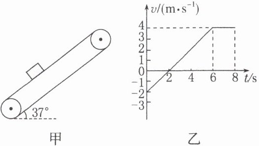 (2)由题图乙知,物体相对传送带滑动时的加速度a=$\frac{\Delta v}{\Delta t}$=1m/s²,此过程中对物体分析得μmgcosθ−mgsinθ = ma,解得μ = 0.875。