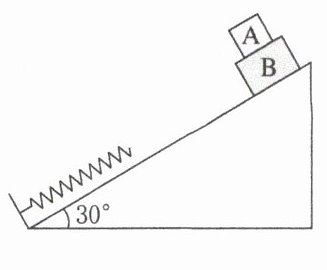 【例5】 如图所示,轻弹簧放置在倾角为30°的斜面上,弹簧下端与斜面底端的挡板相连,可看作质点的小物块A、B叠放在一起,在斜面的顶端由静止释放一起沿斜面下滑。弹簧被压缩到最短时,将物块A从B上轻轻取走(对B的速度不产生影响),此后弹簧将物块B弹出,B刚好又能滑到斜面顶端,已知重力加速度为g,B物块与斜面间动摩擦因数为$\frac{\sqrt{3}}{15}$,则关于A、B的质量m和M之间的关系,下列说法正确的是 ( )