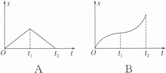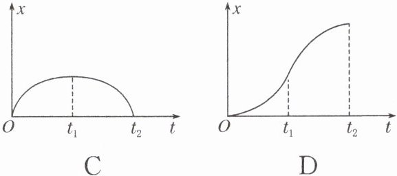 【典例1】(2023·全国甲卷)一小车沿直线运动,从$t = 0$开始由静止匀加速至$t = t_1$时刻,此后做匀减速运动,到$t = t_2$时刻速度降为零。在下列小车位移$x$与时间$t$的关系曲线中,可能正确的是( )