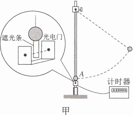 1. 某同学用如图甲所示的装置验证机械能守恒定律。一根细线系住钢球,悬挂在铁架台上,钢球静止于A点。光电门固定在A的正下方,在钢球底部竖直地粘住一片宽度为d的遮光条。将钢球拉至不同位置由静止释放,遮光条经过光电门的挡光时间t可由计时器测出,取$v=\frac{d}{t}$作为钢球经过A点时的速度。记录钢球每次下落的高度h和计时器示数t,计算并比较钢球在释放点和A点之间的势能变化大小$\Delta E_{p}$与动能变化大小$\Delta E_{k}$,就能验证机械能是否守恒。