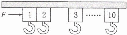 【典例6】 (多选)(2023·广东卷)某同学受电动窗帘的启发,设计了如图所示的简化模型。多个质量均为$1\ kg$的滑块可在水平滑轨上滑动,忽略阻力。开窗帘过程中,电机对滑块1施加一个水平向右的恒力$F$,推动滑块1以$0.40\ m/s$的速度与静止的滑块2碰撞,碰撞时间为$0.04\ s$,碰撞结束后瞬间两滑块的共同速度为$0.22\ m/s$。关于两滑块的碰撞过程,下列说法正确的有 ( )