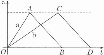 C 解析 由题图可知$AB// CD$,由$v - t$图像斜率表示加速度可知,说明推力撤去后两物体的加速度相等,推力撤去后物体的合力等于摩擦力,由牛顿第二定律可知,两物体受摩擦力大小相等,A项错误;在没有撤去推力前,由动量定理得$(F - F_{f})t = mv - 0$,解得$I_{F}=Ft = mv+F_{f}t$,由题图可知,两物体的最大速度相等,因为推力的作用时间$t_{a}<t_{b}$,所以$F_{1}$的冲量小于$F_{2}$的冲量,B项错误;摩擦力的冲量为$I_{f}=-F_{f}t'$,由题可知,整个过程中a的运动时间小于b的运动时间,而两物体所受摩擦力相等,所以摩擦力对a物体的冲量小于摩擦力对b物体的冲量,C项正确;全程动量变化为0,所以合外力的冲量为0,合外力对a物体的冲量等于合外力对b物体的冲量,D项错误。