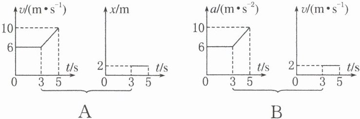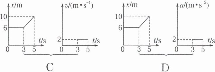 [典例8] C 解析 A项,u−t图像3~5s 为倾斜直线,表示物体做匀加速直线运动,x−t图像3~5s为平行时间轴的直线,表示物体静止,两图像反应的不是同一性质的直线运动,A项错误;B项,a一t 图像3~5s为倾斜直线,表示加速度增大,u−t图像3~5s为平行时间轴的直线,表示物体做匀速直线运动,加速度为零,两图像反应的不是同一性质的直线运动,B项错误;C项,x−t图像0~3s为平行时间轴的直线,表示物体静止,3~5s 为倾斜直线,表示物体做匀速直线运动,且速度大小U=$\frac{10−6}{5−3}$m/s=2m/s,方向沿x轴正方向。U一t图像0~3s速度为零,3~5s为平行时间轴的直线,且速度大小为2m/s,方向沿r轴正方向,C项正确;D项,x一t图像3~5s为倾斜直线,表示物体做匀速直线运动,α一t图像3~5s为平行时间轴的直线,表示物体做匀加速直线运动,D项错误。