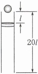 (3)设小球和圆盘从第一次碰撞后瞬间到第二次碰撞前瞬间经历的时间为 $t_{1}$,有 $v_{2}t_{1}=v_{1}t_{1}+\frac{1}{2}gt_{1}^{2}$,解得 $t_{1}=2\sqrt{\frac{2l}{g}}$。在这段时间内,圆盘下落的距离为 $y_{1}=v_{2}t_{1}=2l$。设小球第二次与圆盘碰撞前瞬间速度为 $v'$,则 $v'=v_{1}+gt_{1}=\frac{3\sqrt{2gl}}{2}$。设第二次碰后小球和圆盘的速度分别为 $v_{1}'$、$v_{2}'$,小球和圆盘碰撞过程满足动量守恒和系统机械能守恒,有 $mv'+Mv_{2}=mv_{1}'+Mv_{2}'$,$\frac{1}{2}mv'^{2}+\frac{1}{2}Mv_{2}^{2}=\frac{1}{2}mv_{1}'^{2}+\frac{1}{2}Mv_{2}'^{2}$,解得 $v_{1}' = 0$,$v_{2}'=\sqrt{2gl}$。设小球和圆盘从第二次碰撞后瞬间到第三次碰撞前瞬间经历的时间为 $t_{2}$,有 $\frac{1}{2}gt_{2}^{2}=v_{2}'t_{2}$,解得 $t_{2}=2\sqrt{\frac{2l}{g}}$。在这段时间内圆盘下降的距离为 $y_{2}=v_{2}'t_{2}=4l$。同理,小球第三次与圆盘碰撞前瞬间速度为 $v''=gt_{2}=2\sqrt{2gl}$。小球与圆盘发生第三次碰撞,由动量守恒和系统机械能守恒有 $mv''+Mv_{2}'=mv_{1}''+Mv_{2}''$,$\frac{1}{2}mv''^{2}+\frac{1}{2}Mv_{2}'^{2}=\frac{1}{2}mv_{1}''^{2}+\frac{1}{2}Mv_{2}''^{2}$,解得 $v_{1}''=\frac{\sqrt{2gl}}{2}$,$v_{2}''=\frac{3\sqrt{2gl}}{2}$。设经过 $t_{3}$,两物体发生第四次碰撞,有 $v_{1}''t_{3}+\frac{1}{2}gt_{3}^{2}=v_{2}''t_{3}$,解得 $t_{3}=2\sqrt{\frac{2l}{g}}$。在这段时间里,圆盘下降的距离为 $y_{3}=v_{2}''t_{3}=6l$。由数学归纳法知,以后每次碰撞间隔时间均为 $2\sqrt{\frac{2l}{g}}$。在这段时间内圆盘下降的距离比上次碰撞间隔内下降的距离增加 $2l$,所以从第四次碰撞后瞬间到第五次碰撞前瞬间,圆盘下降的距离为 $8l$,若圆盘始终在管内运动,则从第一次碰撞后瞬间到第五次碰撞前瞬间,圆盘下降的距离为 $y = 2l+4l+6l+8l = 20l>19l$,故此时圆盘已经滑出长直管,不会在管内发生第五次碰撞,所以圆盘在管内运动过程中,小球与圆盘碰撞的次数为 4 次。