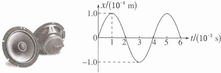 A 解析 $t = 1\times10^{-3}\ s$时刻纸盆中心的位移最大,A项正确;$t = 2\times10^{-3}\ s$时刻纸盆中心位于平衡位置,加速度为零,B项错误;在$0~2\times10^{-3}\ s$之间纸盆中心的速度方向先沿正方向再沿负方向,C项错误;纸盆中心做简谐运动的方程为$x = A\sin\frac{2\pi}{T}t = 1.0\times10^{-4}\sin(500\pi t)\ m$,D项错误。