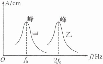 D 解析 当物体做受迫振动时,物体振动的频率等于驱动力频率,A、B两项错误;固有频率与驱动力的频率越接近,振幅越大。由题图可知,甲的固有频率为$f_{0}$,乙的固有频率为$2f_{0}$。若驱动力的频率为$2f_{0}$,甲的振幅小于乙的振幅,C项错误,D项正确。