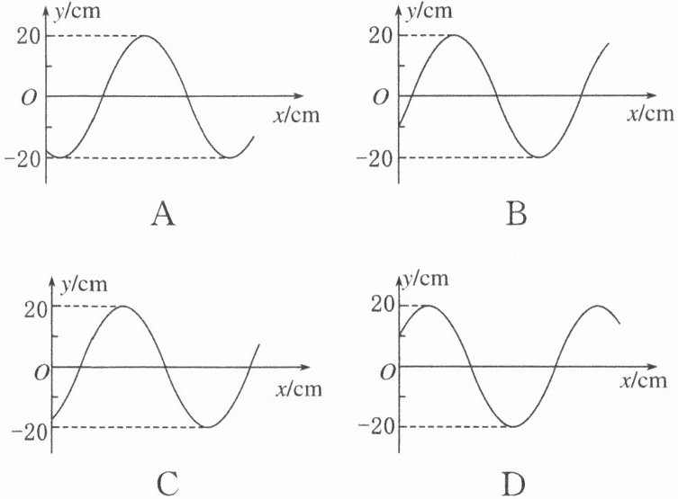 AC 解析 由O点的振动图像可知,周期为T=12s,设原点处的质点的振动方程为y=Asin($\frac{2π}{T}$t+),则10=20sin,解得=$\frac{π}{6}$。在t=7s时刻y,=20sin($\frac{2π}{12}$×7+$\frac{π}{6}$)=−10$\sqrt{3}$cm≈−17.3cm,因7s=$\frac{1}{2}$T+$\frac{1}{12}$T,则在t=7s时刻质点在y轴负向向下振动,根据“同侧法”可判断若波向右传播,则波形为C项所示;若波向左传播,则波形如A项所示。
