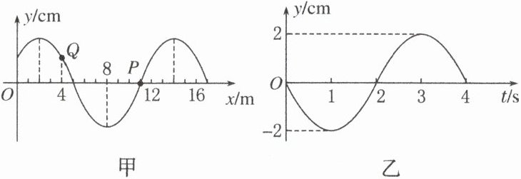 AD 解析 由题图乙知,在t=2s时质点P沿y轴正方向运动,根据上下坡法可知此波沿x轴负方向传播,故A项正确;由题图甲知,波长λ=12m,由题图乙知,周期T=4s,所以波速u=$\frac{x}{T}$=3m/s。在t=2s时,x=14m处的质点处在正向最大位移处,当该点的振动形式传播到Q点时,Q点到达波峰,需时△t=$\frac{14−4}{3}$S=$\frac{10}{3}$s,所以t=$\frac{16}{3}$s时,Q点到达正的最大位移处,故C项错误;因为从题图甲t=2s时刻再经过'=$\frac{1}{3}$s=$\frac{T}{12}$,Q点第一次回到平衡位置,所以t=2s时,Q点的位移为Asin($\frac{2π}{T}$△x)=1cm,故B项错误;圆频率幼=$\frac{2π}{T}$=0.5πrad/s,质点P的振动方程为y=−2sin(0.5πt)cm,故D项正确。