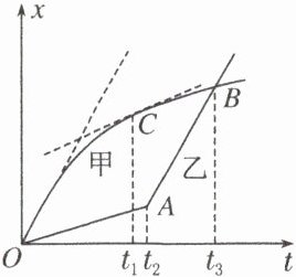 AB 解析 由x−t图像可知,图像的斜率等于速度,则甲、乙两质点是同时、同地、同向出发的,A项正确;在两质点相遇前,t,时刻之前甲的速度大于乙的速度,在t,时刻两质点逵度相等,此时两质点相距最远,B项正确;在t时刻两质点速度相等,则t2时刻甲质点速度小于乙质点的速度,C项错误;t3时刻两质点位移相等,则此时甲、乙两质点相遇,D项错误。