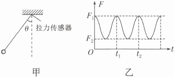 2. 某探究小组探究单摆的装置如图甲所示,细线端拴一个球,另一端连接力传感器,固定在天花板上,将球拉开一定的角度(不大于$5^{\circ}$)静止释放,传感器可绘制出球在摆动过程中细线拉力周期性变化的图像,如图乙。