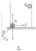 [典例4] D 解析 根据题意,对B受力分析,如图甲所示,由平衡条件有$F_{库}\cos\theta =m_{B}g$,解得小球A、B间的库仑力$F_{库}=\frac {m_{B}g}{\cos\theta }$,B下降,$\theta$变大,$\cos\theta$变小,库仑力$F_{库}$变大,A、B两项错误;根据题意,对A受力分析,如图乙所示,由平衡条件有,筒壁对小球A的支持力为$F = F_{库}\sin\theta$,由于$F_{库}$和$\sin\theta$都变大,则F变大,由牛顿第三定律可知,小球A对筒壁的压力变大,C项错误;以整体为研究对象可知,筒底对A球的支持力大小等于A、B两球的重力之和,由牛顿第三定律可知,A对筒底的压力也等于A、B两球的重力之和,保持不变,D项正确。