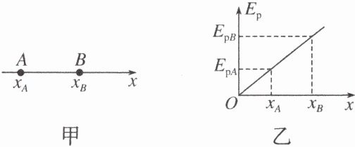 AC 解析 由于A、B两点的电势能与两个位置间的关系如题图乙所示,说明电势能是均匀增加的,故这一定是匀强电场,即不是孤立点电荷形成的电场,A项正确;A、B两点的电场强度相等,B项错误;由题图乙可知,电子在A、B两点的电势能分别为$E_{pA}$和$E_{pB}$,且$E_{pB}>E_{pA}$,说明电子由A运动到B时电势能增大,电场力做负功,电场力对其所做的功为$W = E_{pA}-E_{pB}$,C项正确;电场力做负功,故动能减小,故电子在A点的动能大于在B点的动能,D项错误。