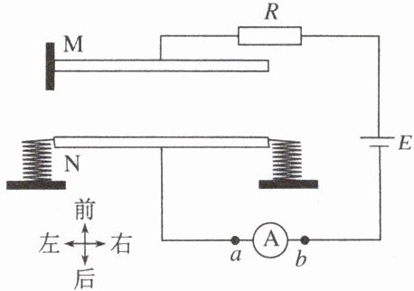 BD 解析 静止时,N板不动,电容器的电容不变,电容器电荷量不变,则电流表示数为零,电容器保持与电源相连,两极板带电,A项错误;由静止突然向后加速时,N板相对向前移动,则板间距减小,根据$C = \frac{\varepsilon_{r}S}{4\pi kd}$知电容C增大,C项错误;由静止突然向前加速时,N板相对向后移动,则板间距增大,根据$C = \frac{\varepsilon_{r}S}{4\pi kd}$知电容C减小,电压不变,由Q = CU知电容器带电量减小,电容器放电,电流由b向a流过电流表,D项正确;由C、D项分析可知,手机“前后”方向运动的加速度越大,电容变化越大,相同时间内电容充电或放电的电荷量大,电路中的电流表示数越大。因此电路中的电流表示数越大,说明手机“前后”方向运动的加速度越大,B项正确。