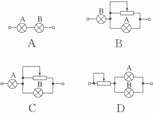 C 解析 由$P = \frac{U^{2}}{R}$和已知条件可知$R_{A}<R_{B}$。对于A电路,由于$R_{A}<R_{B}$,所以$U_{B}>110\ V$,B灯烧毁两灯不能正常发光;对于B电路,由于$R_{A}<R_{B}$,A灯并联变阻器,并联电阻更小于$R_{B}$,所以$U_{B}>110\ V$,B灯烧毁;对于C电路,B灯与变阻器并联,并联电阻可能等于$R_{A}$,所以可能有$U_{A}=U_{B}=110\ V$,两灯可以正常发光;对于D电路,若变阻器的有效电阻等于A、B的并联电阻,则$U_{A}=U_{B}=110\ V$,两灯可以正常发光;比较C、D两个电路,由于C电路中滑动变阻器功率为$(I_{A}-I_{B})\times110\ V$,而D电路中滑动变阻器功率为$(I_{A}+I_{B})\times110\ V$,所以C电路消耗电功率最小,C项正确。