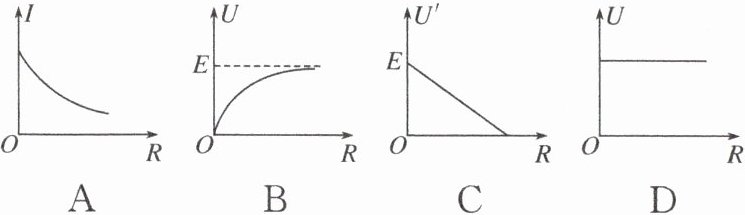 AB 解析 由闭合电路欧姆定律有$I = \frac{E}{R + r}$ ①,路端电压$U = E - Ir = E-\frac{E}{R + r}r=\frac{R}{R + r}E$ ②,内电压$U' = Ir=\frac{r}{R + r}E$ ③。根据①式可知,I随R的增大单调递减,但不是线性变化,A项正确;将②式变形可得$U = \frac{1}{1+\frac{r}{R}}E$,利用数学知识可知B项正确,D项错误;根据③式可知,C项错误。