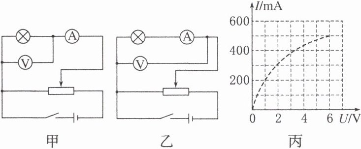 (1)小灯泡的电阻$R_{L}=\frac{U^{2}}{P}=12\ \Omega$,由题图丙知当电压为6V时,灯泡的电阻约为$R = \frac{U}{I}\approx\frac{6}{0.5}\ \Omega = 12\ \Omega$,说明测量误差较小。因电压表内阻比小灯泡电阻大得多,采用电流表外接法测量误差小,即选择的电路应为甲。