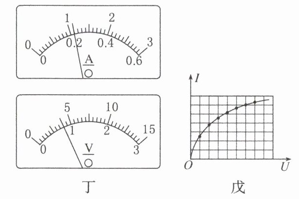 (4)闭合开关,改变滑动变阻器滑动端的位置,并记录对应的电流表示数I、电压表示数U。某次测量中电流表选择0~0.6 A量程,电压表选择0~15 V量程,电流表、电压表示数如图丁所示,可知该状态下小灯泡电阻的测量值$R_{x}=\frac{U}{I}=$______Ω(保留2位有效数字)。