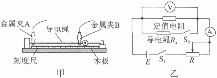 如图甲所示,导电绳的一端固定,另一端作为拉伸端,两端分别用带有金属夹 A、B 的导线接入如图乙所示的电路中。