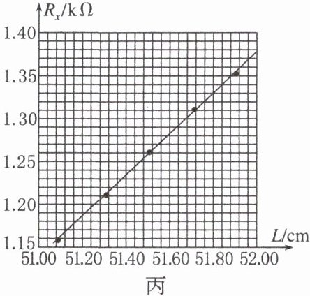 (4) 图丙是根据部分实验数据描绘的$R_{x} - L$图线。将该导电绳两端固定在某种机械臂上,当机械臂弯曲后,测得导电绳的电阻$R_{x}$为 1.33 kΩ,则由图线可读出导电绳拉伸后的长度为______cm,即为机械臂弯曲后的长度。