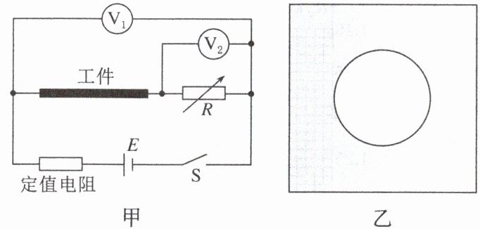 3. 如图所示,物理兴趣小组设计了如图甲所示的实验电路测量中空长方体金属工件的电阻率。其中电路中定值电阻的阻值为$R_{0}$,长方体金属工件的截面如图乙所示,其截面为边长为 a 的正方形,截面的中空部分为圆形,其直径为$\frac{a}{2}$,金属工件长度为 L。