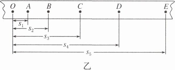 (2)小组选取了如图乙所示的一条纸带,O、A、B、C、D、E为选取的计数点,每两个相邻计数点间还有4个点没有画出,各计数点到O点的距离分别为$s_{1}$、$s_{2}$、$s_{3}$、$s_{4}$、$s_{5}$。已知交流电源的频率为$f$,则D点对应的瞬时速度大小为________(用已知字母表示)。