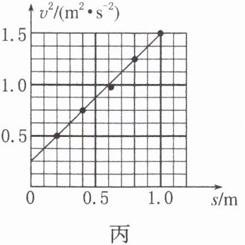 (3)小组根据各计数点的速度$v$与各计数点到O点的距离$s$作出$v^{2}-s$图像如图丙所示,则打下O点时小车速度的大小为________m/s,小车加速度大小为________m/s²。(结果均保留2位有效数字)