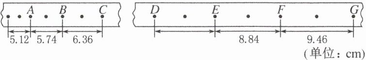 (2)小车通过A点的瞬时速度为$v_{A}=\frac{(5.12 + 5.74)\times10^{-2}}{2\times0.04}m/s\approx1.36m/s$,根据匀变速直线运动的规律可知$x_{EF}-x_{DE}=x_{FG}-x_{EF}$,代入数据解得$DE$间距离约为$x_{DE}=8.22cm$。由题可知,连续相等时间的位移差为$\Delta x = 0.62cm$,根据$\Delta x = at^{2}$可知$a=\frac{\Delta x}{t^{2}}=\frac{0.62\times10^{-2}}{0.04^{2}}m/s^{2}\approx3.88m/s^{2}$。