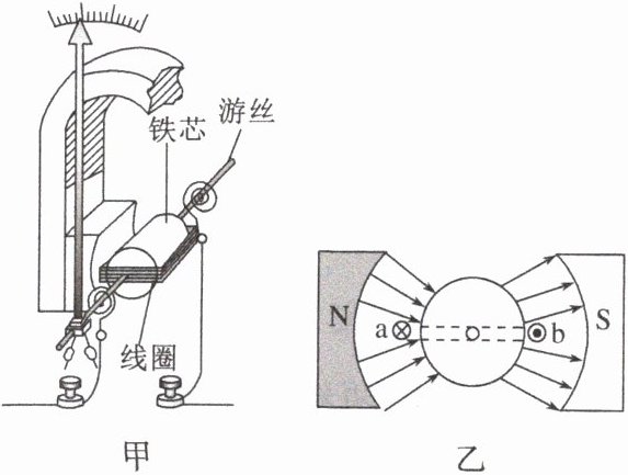 [典例5] (多选)电流计等磁电式电表是利用永久磁铁对通电线圈的作用原理制成的,其优点是灵敏度高。构造如图甲所示,圆柱形铁芯固定于U形磁铁两极间,其中磁场是均匀辐向分布,铁芯外面套有缠绕着线圈并可转动的铝框,铝框的转轴上装有指针和游丝(又称螺旋弹簧)。下列说法正确的是 ( )