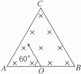 【典例7】如图所示,在边长为$2a$的正三角形区域内存在方向垂直于纸面向里的匀强磁场,一个质量为$m$、电荷量为$-q(q > 0)$的带电粒子(重力不计)从$AB$边的中心$O$以速度$v$进入磁场,粒子进入磁场时的速度方向垂直于磁场且与$AB$边的夹角为$60^{\circ}$,若要使粒子能从$AC$边穿出磁场,则匀强磁场磁感应强度的大小$B$需满足( )