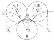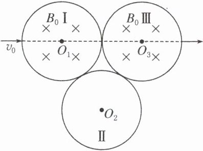 【典例 1】(多选)如图所示,三个半径均为 R 的圆形区域Ⅰ、Ⅱ、Ⅲ,圆形区域两两相切,圆心分别为$O_1$、$O_2$、$O_3$,三个圆形区域内均存在垂直纸面的匀强磁场,其中区域Ⅰ、Ⅲ内存在垂直纸面向里的匀强磁场,磁感应强度均为$B_0$,一粒子以速度$v_0$沿$O_1O_3$方向从区域Ⅰ边界进入磁场,通过三个区域后沿$O_1O_3$方向从区域Ⅲ边界射出,已知粒子电荷量为 q,质量为 m,不考虑重力,则以下说法正确的是( )