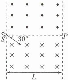 【典例11】(多选)(2022·湖北卷)在如图所示的平面内,分界线$SP$将宽度为$L$的矩形区域分成两部分,一部分充满方向垂直于纸面向外的匀强磁场,另一部分充满方向垂直于纸面向里的匀强磁场,磁感应强度大小均为$B$,$SP$与磁场左右边界垂直。离子源从$S$处射入速度大小不同的正离子,离子入射方向与磁场方向垂直且与$SP$成$30^{\circ}$角。已知离子比荷为$k$,不计重力。若离子从$P$点射出,设出射方向与入射方向的夹角为$\theta$,则离子的入射速度和对应$\theta$角的可能组合为 ( )