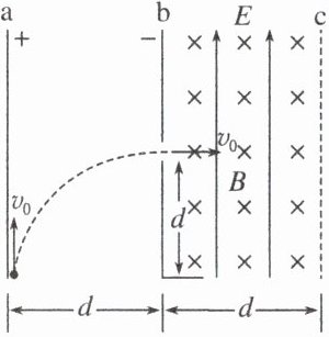 【典例 2】(多选)如图所示,竖直放置的两块很大的平行金属板$a$、$b$,相距为$d$,$a$、$b$间的电场强度为$E$,今有一带正电的微粒从$a$板下边缘以初速度$v_{0}$竖直向上射入电场,当它飞到$b$板时,速度大小不变,而方向变为水平方向,且刚好从高度也为$d$的狭缝穿过$b$板而进入$bc$区域,$bc$区域的宽度也为$d$,所加电场强度大小为$E$,方向竖直向上,磁场方向垂直纸面向里,磁感应强度大小等于$\frac{E}{v_{0}}$,重力加速度为$g$,则下列关于粒子运动的有关说法正确的是( )
