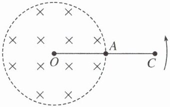 【典例4】 (2023·江苏卷)如图所示,圆形区域内有垂直纸面向里的匀强磁场,OC导体棒的O端位于圆心,棒的中点A位于磁场区域的边缘。现使导体棒绕O点在纸面内逆时针转动。O、A、C点电势分别为$\varphi_{O}$、$\varphi_{A}$、$\varphi_{C}$,则( )