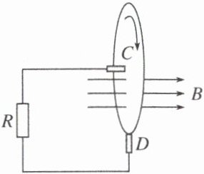 C 解析 圆盘发出的是直流电,A项错误;由法拉第电磁感应定律可得,法拉第圆盘发电机的电动势为E = $\frac{1}{2}$Bl²ω,电源的输出功率为P = I²R = ($\frac{E}{R + r}$)²R = $\frac{B²l⁴ω²R}{4(R + r)²}$,B项错误,C项正确;根据右手定则,流过电阻R的电流方向为D→R→C,D项错误。