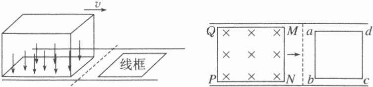 【典例1】 电磁制动原理是通过线圈与磁场的作用使物体做减速运动。某列车车底安装的电磁铁产生磁场可视为匀强磁场,磁感应强度大小为B,方向竖直向下。同种材料制成的粗细均匀的闭合正方形线框abcd,边长为$L_{1}$,MN长为$L_{2}(L_{2}>L_{1})$,若当列车MN部分刚越过ab时,速度大小为v,则ab两端的电势差$U_{ab}$等于( )