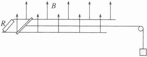 【典例 2】(多选)如图所示,两根足够长的光滑平行金属导轨固定放置在足够高的水平台面上,导轨间距$L = 1\ m$。质量$m = 1\ kg$,电阻$r = 2\ \Omega$,长度为$L$的直导体棒放在导轨上,且始终与导轨垂直,导体棒通过一根轻质细绳绕过定滑轮与一质量也为$m = 1\ kg$的重物相连。导轨左端与阻值$R = 2\ \Omega$的电阻相连,导轨电阻不计,整个装置放在竖直向上的匀强磁场中,磁感应强度$B = 2\ T$。在$t = 0$时刻,由静止释放导体棒和重物,直导体棒由静止开始向右做直线运动(导轨足够长,轻质细绳始终与导轨共面且平行),$g = 10\ m/s^{2}$。下列说法中正确的是( )