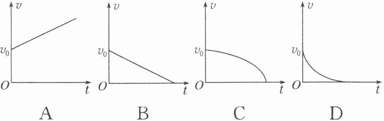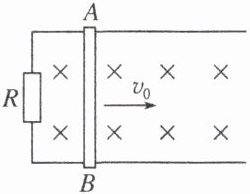 【典例 1】如图所示,绝缘水平面上有两条平行光滑长直导轨,导轨左端接有电阻$R$,电阻为$r$的金属棒$AB$垂直跨放在导轨上且与导轨接触良好,其他电阻不计。两导轨间存在竖直向下的匀强磁场。给$AB$以水平向右的初速度$v_{0}$并开始计时,下面四幅反映$AB$的速度$v$随时间$t$变化规律的图像中,可能正确的是( )
