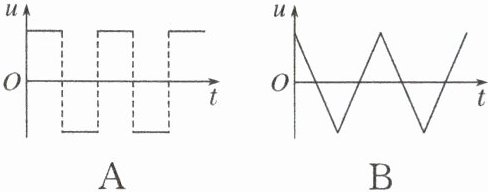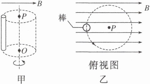 【典例3】(2023·辽宁卷)如图,空间中存在水平向右的匀强磁场,一导体棒绕固定的竖直轴$OP$在磁场中匀速转动,且始终平行于$OP$。导体棒两端的电势差$u$随时间$t$变化的图像可能正确的是 ( )