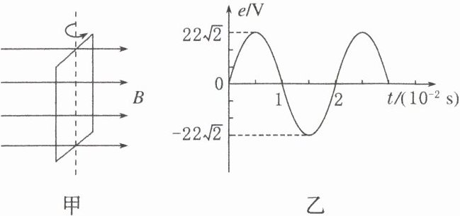 B 解析 由题图知$t = 0.01$ s时,感应电动势为零,则穿过线框的磁通量最大,A项正确;该线框转动的角速度大小为$\omega=\frac{2\pi}{T}=100\pi$ rad/s,B项错误;当$t = 0$时,电动势为零,线框平面与磁场方向垂直,故该交变电动势的瞬时值表达式为$e = E_{m}\sin\omega t = 22\sqrt{2}\sin(100\pi t)$ V,C项正确;线框平面与中性面的夹角为$45^{\circ}$时,电动势瞬时值为$e = E_{m}\sin45^{\circ}= 22$ V,D项正确。
