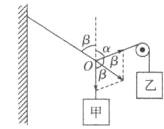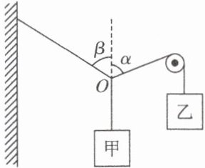 【典例6】 (2020·全国卷Ⅲ)如图,悬挂甲物体的细线拴牢在一不可伸长的轻质细绳上$O$点处;绳的一端固定在墙上,另一端通过光滑定滑轮与物体乙相连。甲、乙两物体质量相等。系统平衡时,$O$点两侧绳与竖直方向的夹角分别为$\alpha$和$\beta$。若$\alpha = 70^{\circ}$,则$\beta$等于( )