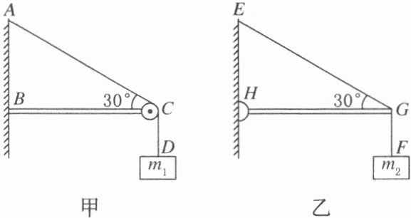 【典例7】 如图甲所示,轻绳$AD$跨过固定在水平横梁$BC$右端的定滑轮挂住一个质量为$m_{1}$的物体,$\angle ACB = 30^{\circ}$;如图乙所示的轻杆$HG$一端用铰链固定在竖直墙上,另一端$G$被细绳$EG$拉住,$EG$与水平方向成$30^{\circ}$角,轻杆的$G$点用细绳$GF$拉住一个质量为$m_{2}$的物体,重力加速度为$g$,则下列说法正确的是( )