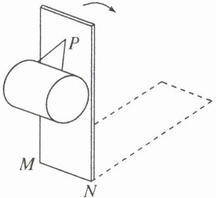 如图,用两根等长的细绳将一匀质圆柱体悬挂在竖直木板的P点,将木板以底边MN为轴向后方缓慢转动直至水平,绳与木板之间的夹角保持不变,忽略圆柱体与木板之间的摩擦,在转动过程中 ( )