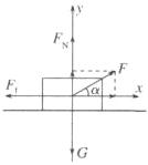 B 解析 受力分析如图所示,因为物体处于平衡状态,水平方向有$F\cos\alpha=\mu F_{N}$,竖直方向有$F\sin\alpha + F_{N}=mg$,联立可解得$F=\frac{\mu mg}{\cos\alpha+\mu\sin\alpha}=\frac{\mu mg}{\sqrt{1 + \mu^{2}}\sin(\alpha+\varphi)}$,$\tan\varphi=\frac{1}{\mu}$,当$\alpha+\varphi = 90^{\circ}$时,$\sin(\alpha+\varphi)=1$,$F$有最小值$F_{min}=\frac{\mu mg}{\sqrt{1+\mu^{2}}}$,代入数值得$\mu=\frac{3}{4}$,此时$\alpha=\theta$,$\tan\theta=\tan\alpha=\frac{3}{4}$,$B$项正确。