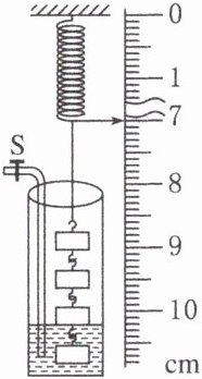 3. 如图为某同学在“探究弹簧弹力与形变量的关系”时的实验装置,让刻度尺零刻度线与弹簧上端平齐,弹簧不挂物体时下端指针所指的标尺刻度为$x_0$,在弹簧下端用足够长的轻质细线挂上4个相同的钩码(弹簧处于弹性限度内),静置于烧杯内(钩码与烧杯底面不接触),控制阀门S通过细胶管向烧杯中缓慢注水,依次浸没4个钩码,记录每浸没一个钩码时指针所指的标尺刻度$x_1$、$x_2$、$x_3$、$x_4$,已知每个钩码质量均为$m$,重力加速度为$g$。以$x_n$为纵坐标,$n$为横坐标建立坐标系,作出$x_n$和浸没钩码个数$n$的关系图线,求得图线斜率为$a$,纵轴截距为$b$,则该弹簧的劲度系数为______,每个钩码所受浮力为______。(用$a$、$b$、$m$、$g$和$x_0$表示)