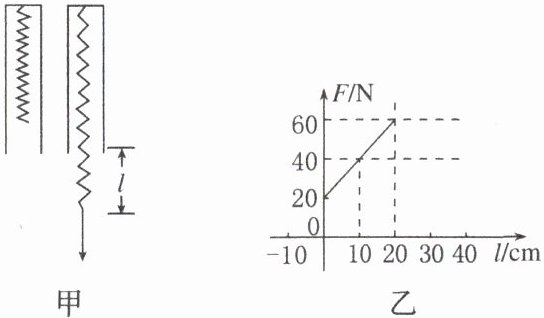 2. 某同学在研究性学习中,利用所学的知识解决了如下问题:一轻质弹簧竖直悬挂于某一深度为$h = 30.0$cm且开口向下的小筒中(没有外力作用时弹簧的下端位于筒内,用测力计可以和弹簧的下端接触),如图甲所示,若本实验的长度测量工具只能测量露出筒外弹簧的长度$l$,现要测出弹簧的原长$l_0$和弹簧的劲度系数,该同学通过改变$l$而测出对应的弹力$F$,作出$F - l$图像如图乙所示,则弹簧的劲度系数$k =$______N/m,弹簧的原长$l_0 =$______cm。