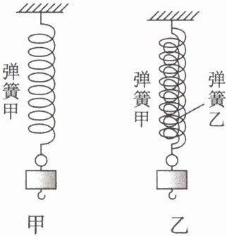 4. 在“探究弹簧弹力与形变量的关系”实验中,某同学先按图甲所示对弹簧甲进行探究,然后把等长的弹簧乙(直径小于甲)套在弹簧甲内,两弹簧悬挂在同一点按图乙所示进行探究。在弹性限度内,将质量$m = 50$g的钩码逐个挂在弹簧下端,测得图甲、图乙中弹簧的长度$L_1$、$L_2$如下表所示。