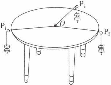 1. 用如下的器材和方法可以验证“力的平行四边形定则”。在圆形桌子的透明桌面上平铺一张白纸,在桌子边缘安装三个光滑的滑轮,其中滑轮P₁固定在桌子边,滑轮P₂、P₃可沿桌边移动。第一次实验,步骤如下: