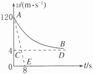 (2)在初始时刻,$v_{A}=120m/s$,过A点的切线的斜率的绝对值即为此时的加速度大小,则有$a=\vert\frac{\Delta v}{\Delta t}\vert=\frac{120}{8}m/s^{2}=15m/s^{2}$。
